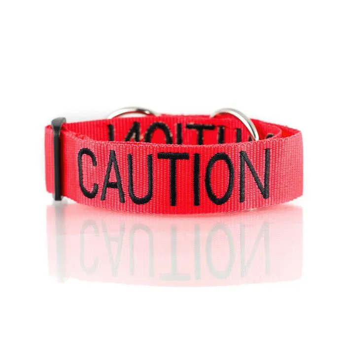The CAUTION Awareness Collar is red and embroidered with the word CAUTION to warn people that their dog needs space and should not be approached.