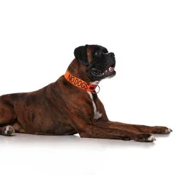 The NO DOGS Awareness Collar is orange and embroidered with the words NO DOGS to inform other dog owners and fellow walkers that their dog is ok meeting and greeting other people but isn’t so keen on other dogs and therefore requires space.