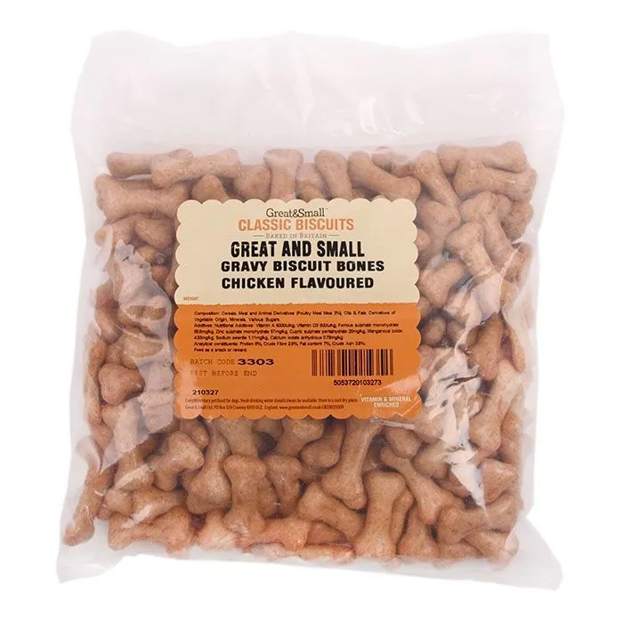 Great&Small Gravy Biscuit Bones Chicken. Great&Small Gravy Biscuit Bones Chicken are delicious, traditionally baked, chicken flavoured biscuits that your dog is sure to love.