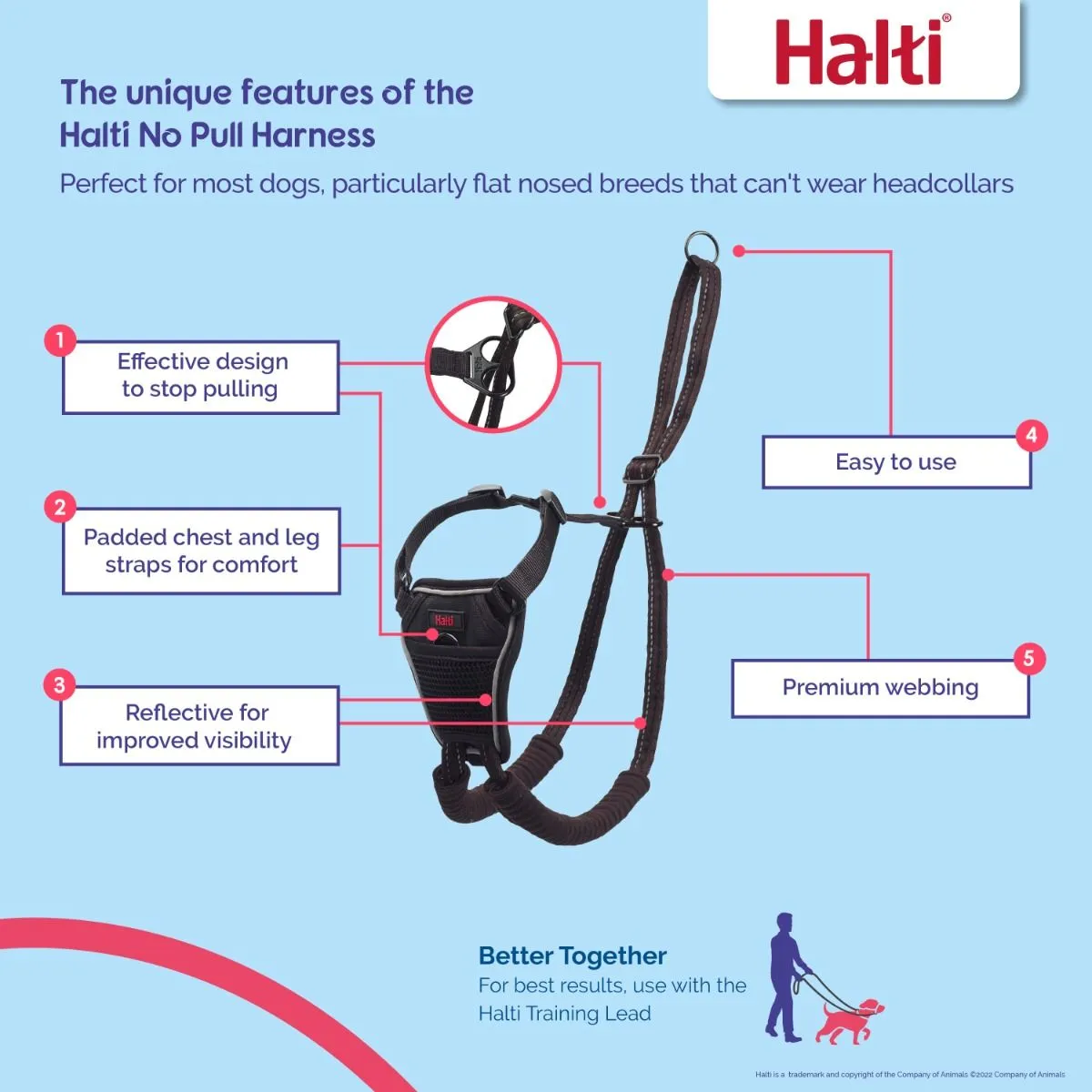 Training your dog not to pull is made simpler with the aid of a Halti Harness from Company of Animals. A simple no pull solution for most dogs, with both a no pull lifting action and front control steering. A perfect option for flat nosed breeds who can’t wear a headcollar.