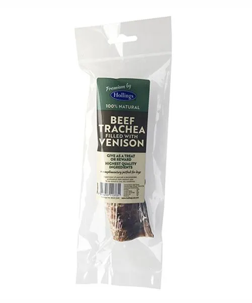 Ideal to help appease periods of boredom, Hollings 100% Natural beef trachea with Venison filling are quality treats that your dog is sure to enjoy. Regular chewing is encouraged which can help to remove plaque or tartar build up from your dog’s teeth. In addition, these Beef trachea’s are salmonella and bacteria tested. Hollings 100% Natural beef trachea are an ideal way to reward or treat your four legged friend!