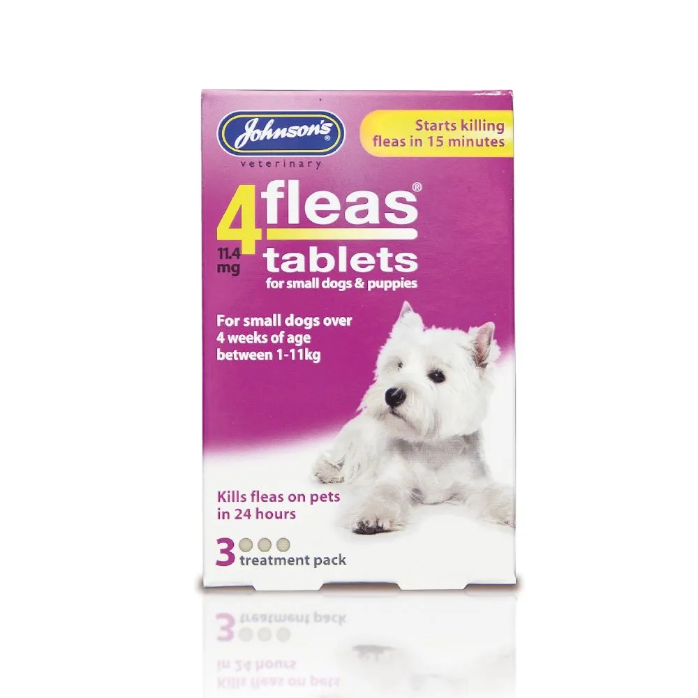 Johnsons 4Fleas Tablets kill Fleas on Puppies and Small Dogs over 4 weeks of age and weighing up to 11kg. The 4Fleas Tablets start killing Fleas in 15 minutes and kill all Fleas on pets in 24 hours and are safe to use with other Flea and Worm treatments.