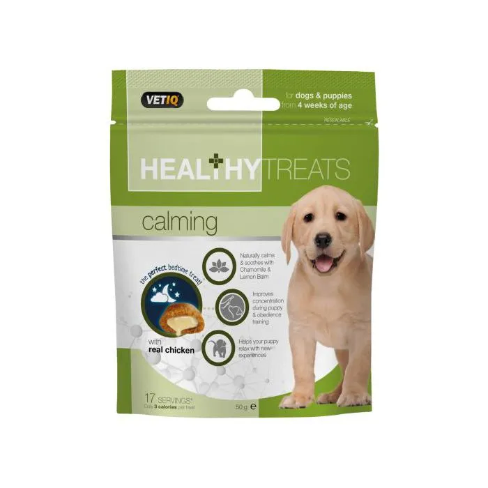 VetIQ Healthy Calming Treats contain a unique blend of lemon balm, chamomile and the amino acid L-Tryptophan to naturally calm and soothe puppies.