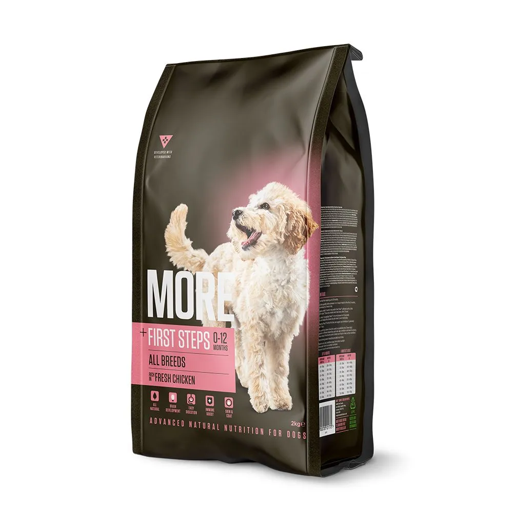 MORE™ Dog +First Steps Chicken is a complete, balanced dry dog food made using high-quality fresh meat with meat meal. Formulated using hypoallergenic principles,MORE™ Dog +First Steps Chicken doesn’t contain any by-products or ingredients that are commonly known to cause allergies including wheat, gluten, soya, beef or dairy so it’s ideal for puppies with sensitive tummies.