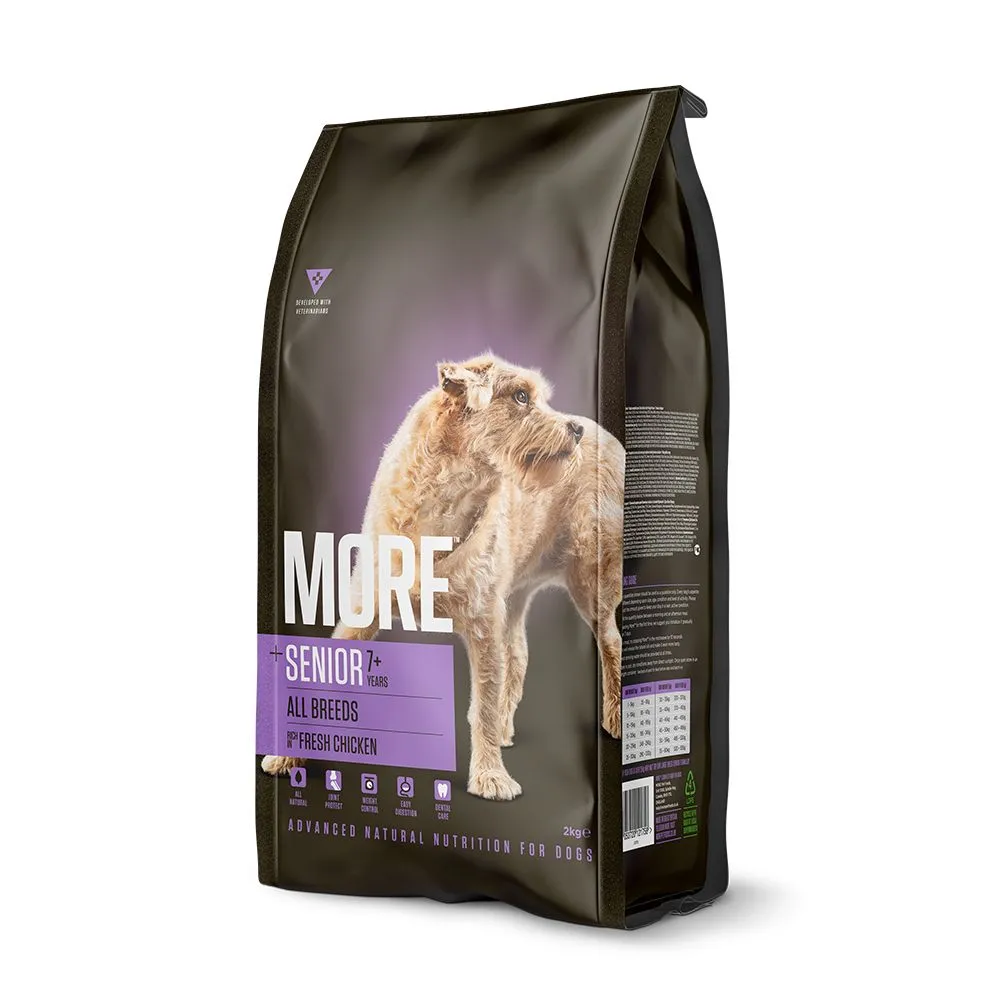 MORE™ Dog +Senior All Breeds Chicken is a complete, balanced dry dog food made using high-quality fresh meat with meat meal. Formulated using hypoallergenic principles,MORE™ Dog +Senior All Breeds Chicken doesn’t contain any by-products or ingredients that are commonly known to cause allergies including wheat, gluten, soya, beef or dairy, so it’s ideal for dogs with sensitive tummies.