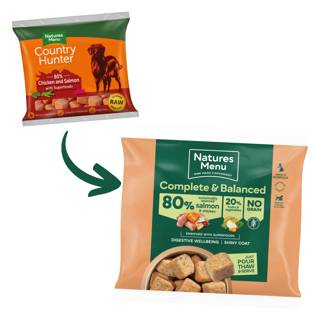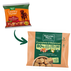 Natures Menu 80/20 Salmon and Chicken enriched with Superfoods Nuggets are made with 50% chicken and 30% salmon and a delicious blend of chicken, salmon, served up with our tasty mix of vegetables, peas, vitamins and minerals. Natures Menu 80/20 Nuggets are packed to contain only the highest quality ingredients, made to be nutritionally adequate for a dogs daily nutritional requirements.