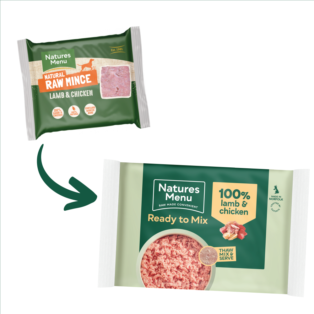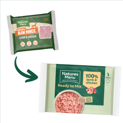 Natures Menu Blocks are made from quality ingredients: minced Lamb & Chicken, blended into a tasty, nutritious meat portion for home prepared raw meals for dogs.