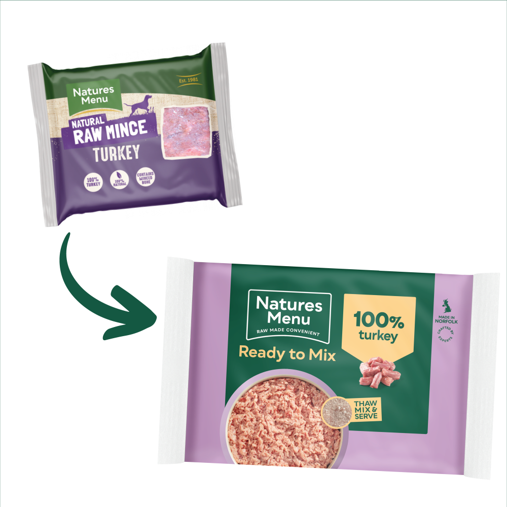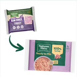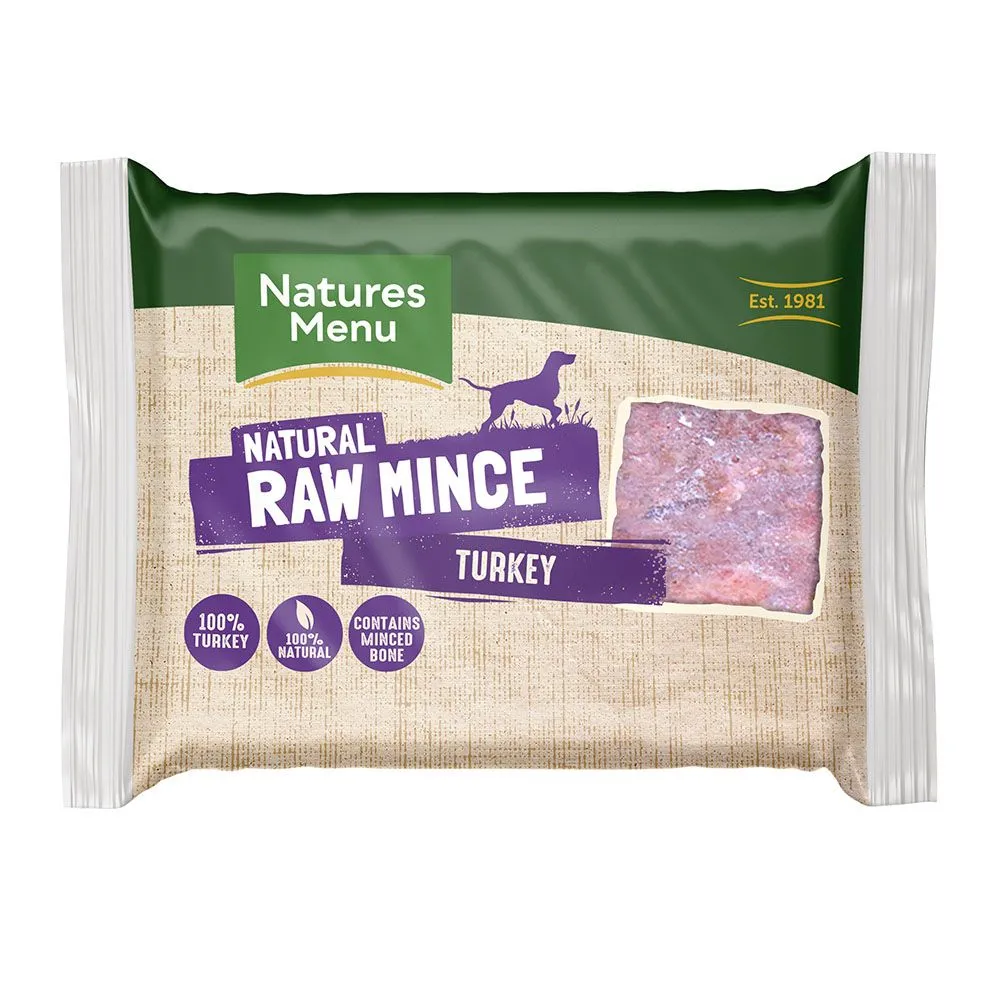 Natures Menu Blocks are made from quality ingredients: minced turkey, blended into a tasty, nutritious meat portion for home prepared raw meals for dogs.