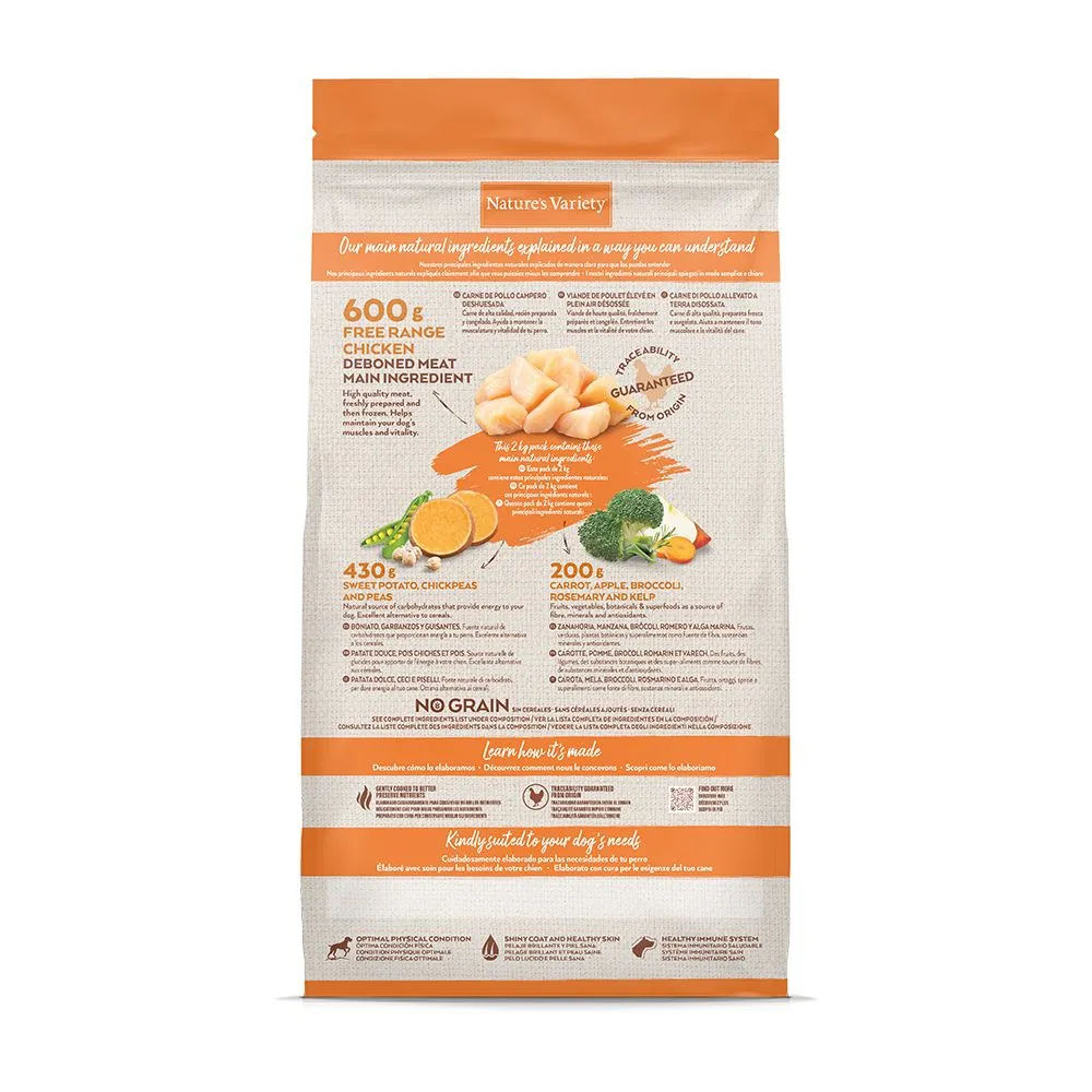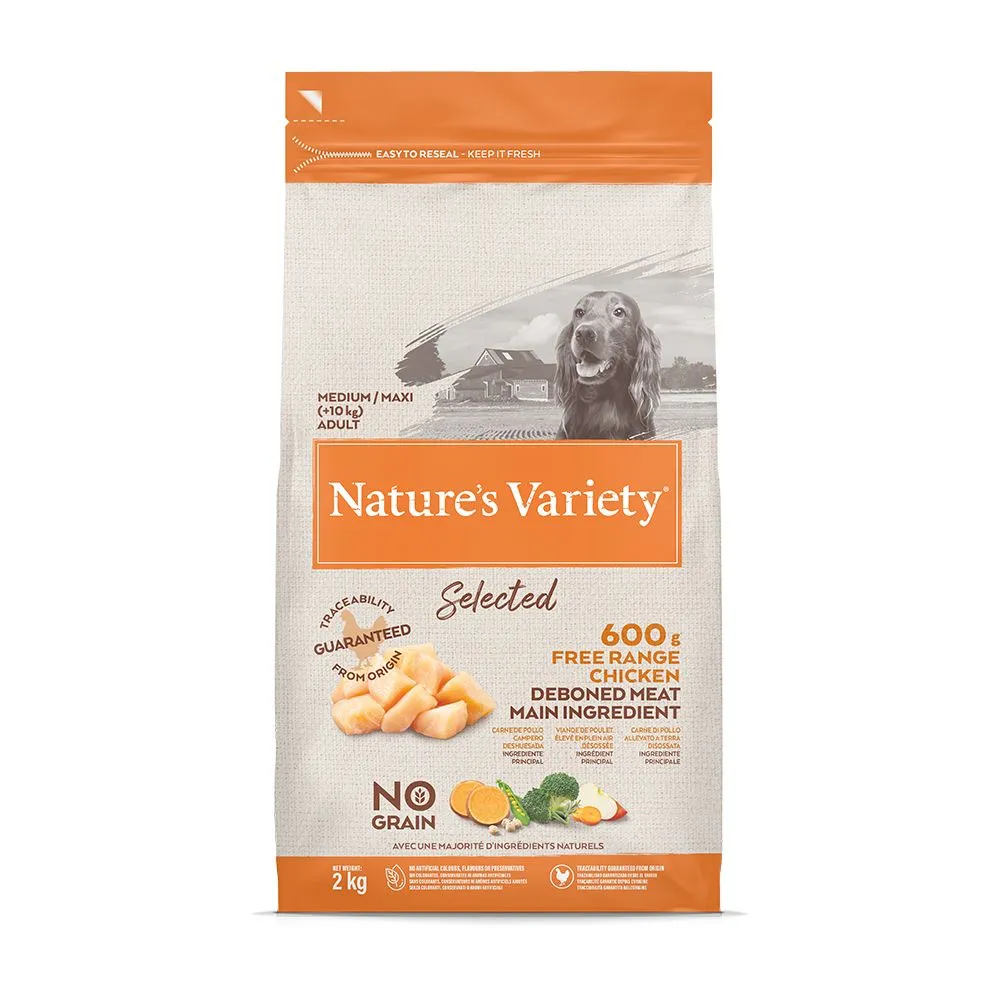 Nature’s Variety Selected dry food is made with quality free range boneless chicken as its main ingredient to create a high meat recipe.The high quality deboned meat is blended with selected natural superfoods, vegetables, fruits and botanicals including berries, chickpeas and rosemary to deliver complete and balanced meals your dog will love.