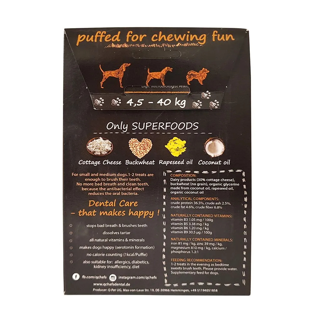 Our dog’s teeth need the very best care and attention. To keep them strong and healthy they need the very best ingredients! Q –Chef Dental Power Puffies are an innovation in doggy dental health.